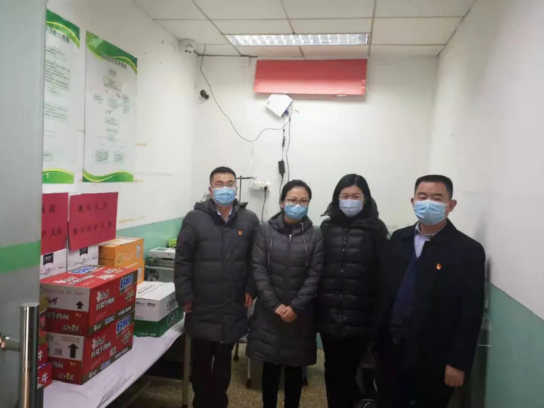 圖 | 德元人力黨支部書記田志(左一),左家莊街道黨工委副書記閆立春(左二),街道武裝部長丁法武(右一),漁陽飯店黨總支委員、第一黨支部書記張璐(右二)一同慰問接種點醫護人員